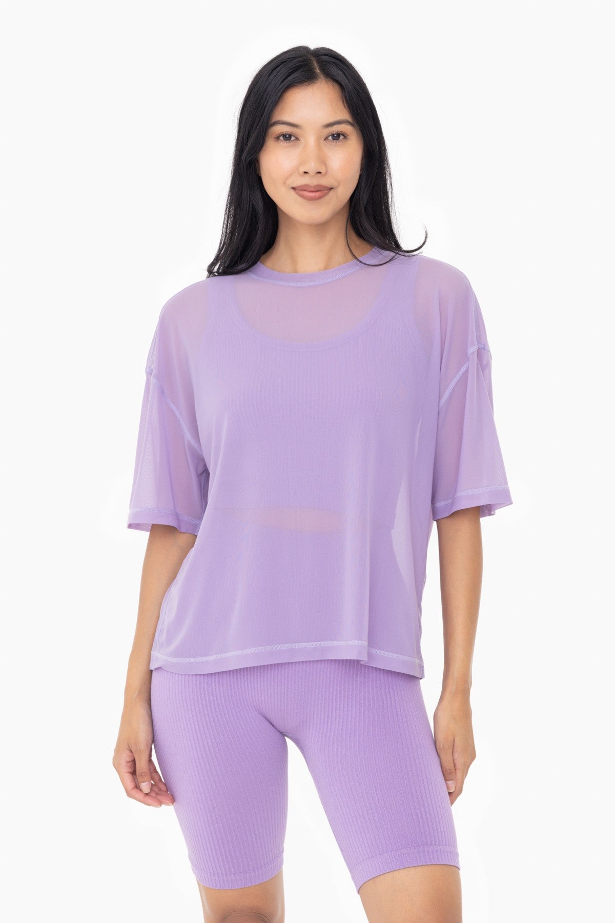 A lightweight layer for your next gym look, this sheer power mesh top is made from a nylon blend fabric with a soft handfeel, has a boxy silhouette, and four-way stretch for a comfortable fit. Layer over your sports bra or bandeau top for an easy edgy look.
