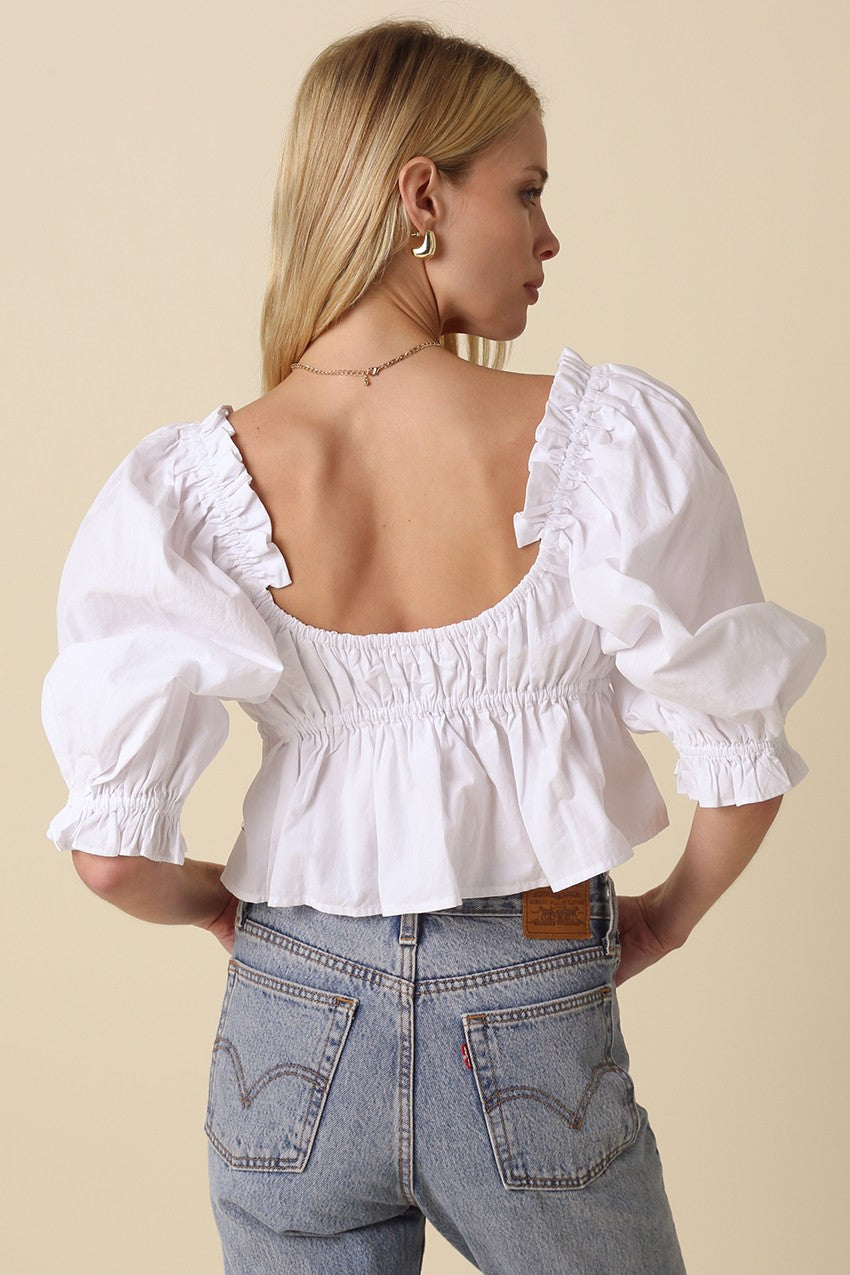 Our Jamie Tie-Front Cropped Blouse features a square neckline with elastic ruffle trim and double tie front closure at the bust. And cropped peplum hem with voluminous short puff sleeves and elasticated cuffs. Woven